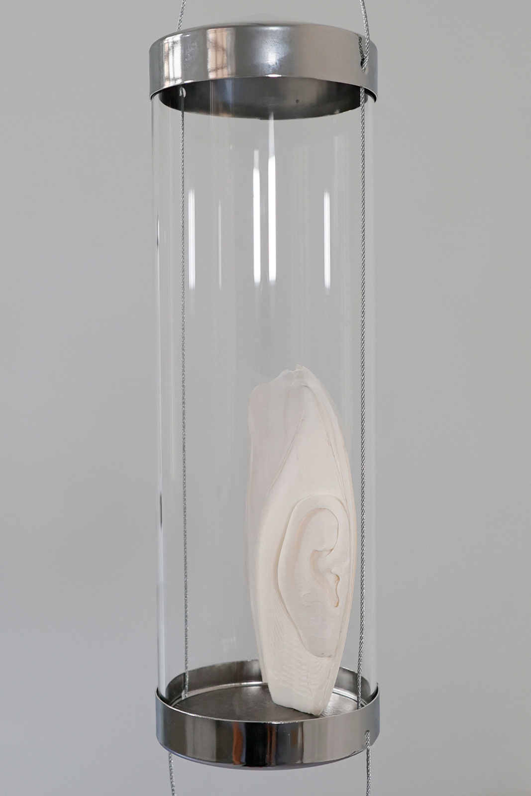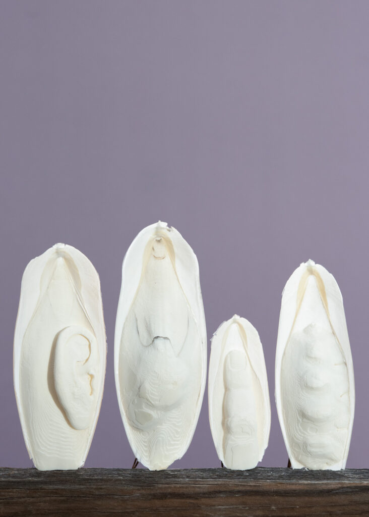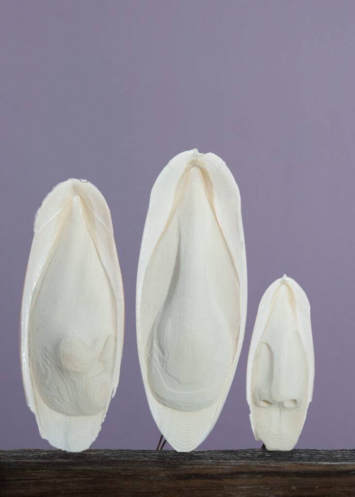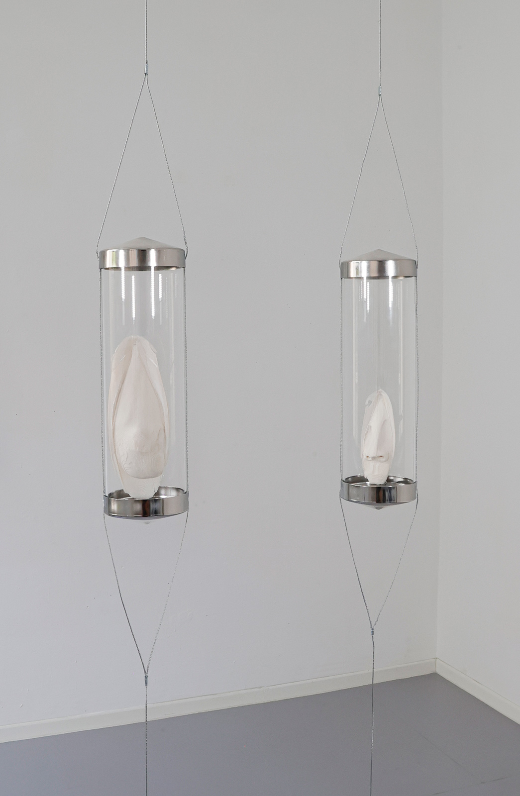 This installation was created during a residency in Catania, Sicily. Cuttlefish are the only species of squid that have an internal skeleton in the form of a seed-shaped bone. This so-called cuttlebone consists of various layers supported by columns. Due to its porosity, it serves as a buoyancy aid for the cuttlefish. Its material structure is very similar to that of human bones, which is why it is being researched as a biocompatible material for bone repair after injury or illness. I obtained the cuttlebones from local fishermen in the port of San Giovanni li Cuti. For some of the cuttlefish, I was the last person they ever saw. They have a very strong memory for people. Accompanying this work are poems in which the vulnerability and grief of human and cuttlefish bodies are superimposed. They will be published in a book together with contributions from four other artists.